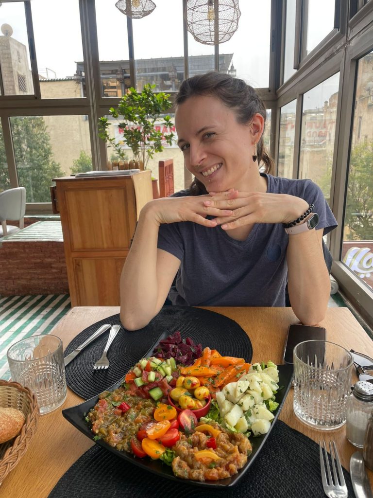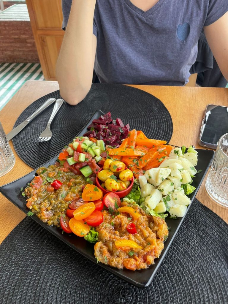 On prend chacune un smoothie à l’avocat super bon ainsi qu’une entrée à la « marocaine », et bien sûr, un couscous à l’agneau à partager à deux. Les portions sont assez grosses. On en a largement assez pour deux.