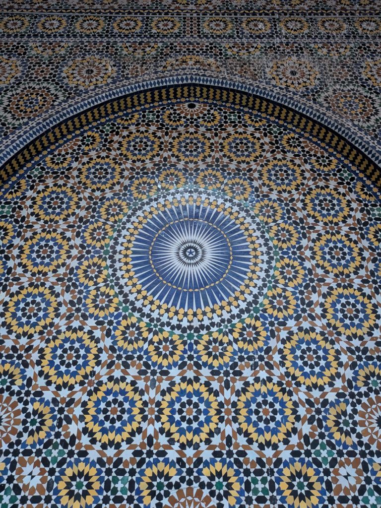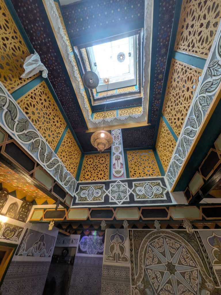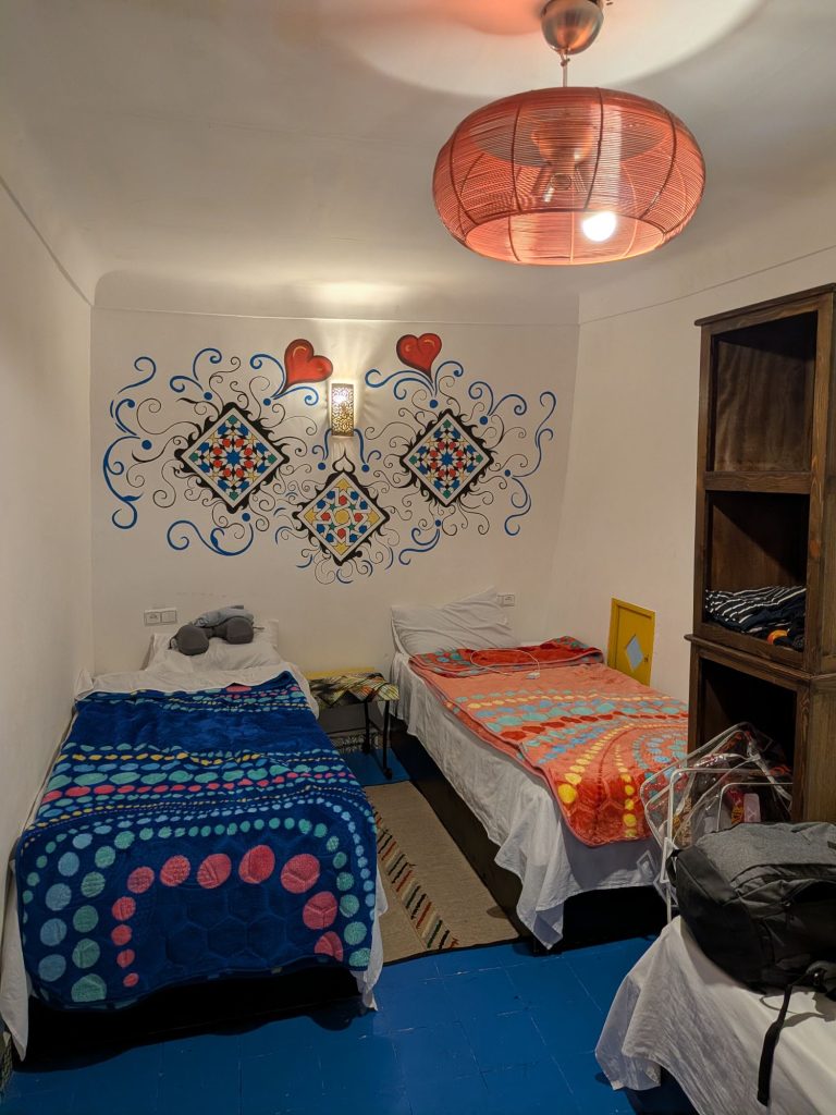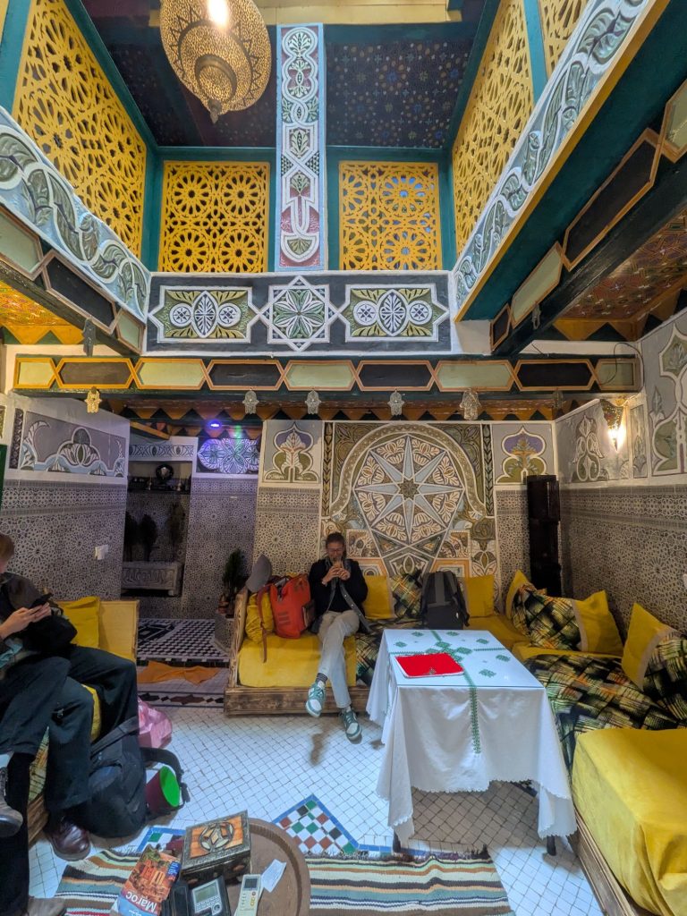 Notre riad est plutôt mignon. Notre chambre n’est pas encore prête. Nous entendons la femme de chambre qui doit être la grand-mère du réceptionniste en train de récurer la chambre de fond en comble.
