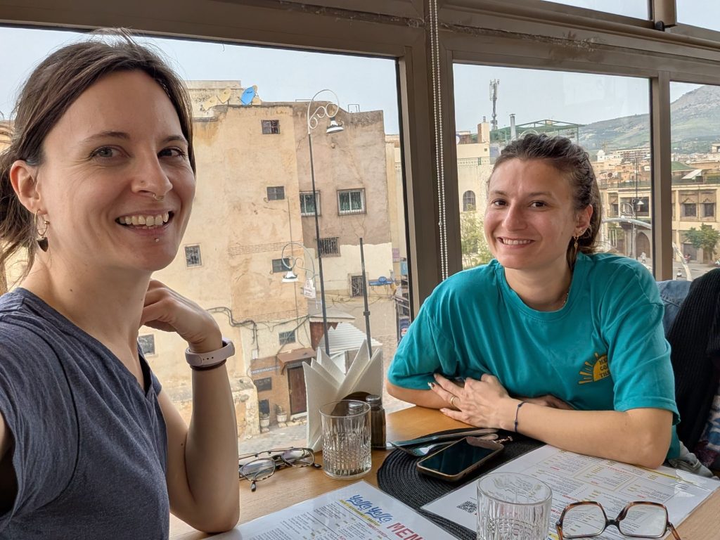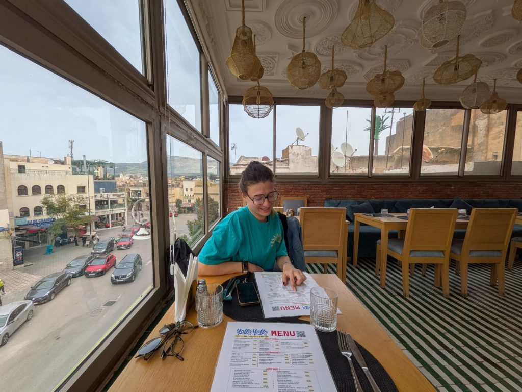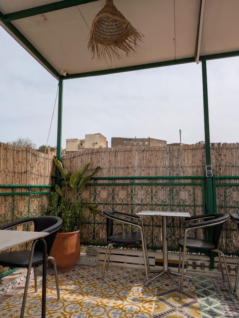 Nous attendons sur le toit-terrasse très agréable avec une vue sur la médina assez jolie. Le temps est bon, le ciel est bleu !
