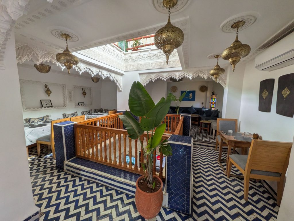 Une fois nos sacs déposés dans notre chambre (petite mais fonctionnelle dirons-nous), nous retournons vers la place où nous attendions le réceptionniste car on nous a indiqué qu’il y avait un restaurant à cet endroit-là. Il faut se souvenir quand même que nous voyageons au Maroc pendant le Ramadan, donc beaucoup de restaurants sont fermés le midi.