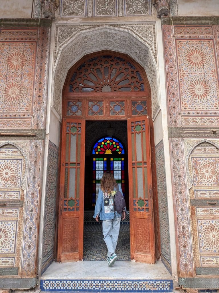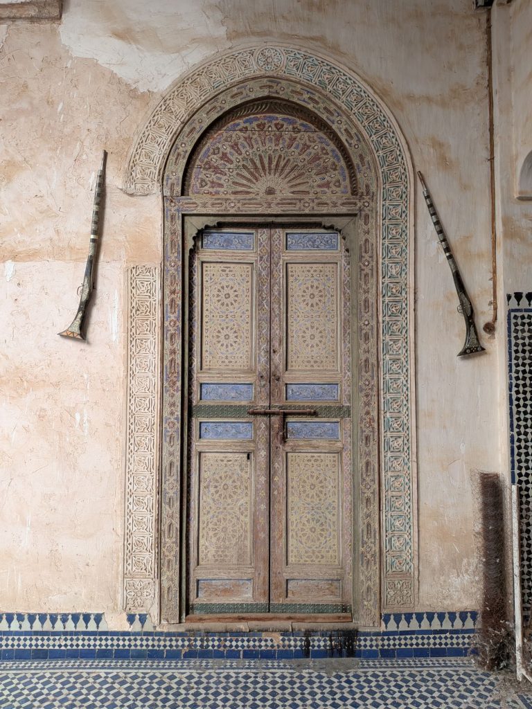 Après réflexion, nous décidons de sortir un peu de la médina pour essayer d’aller voir les murs du Palais Royal puisque nous ne sommes trop loin. En chemin normalement nous pouvons aller voir un jardin. Sauf qu’à cette heure-ci le jardin est fermé donc nous trouvons une autre alternative pour combler notre fin de journée. Julie trouve un palais abandonné à visiter, le palais Glaoui. qui est tenu par un homme qui est né dedans et qui aujourd’hui passe sa vie à essayer de le maintenir coûte que coûte. En chemin pour aller là-bas, nous croisons deux marocains qui nous disent que le palais est fermé car en ce moment c’est le ramadan et que tout ferme assez tôt. Nous décidons quand même de poursuivre notre chemin quitte à passer devant le palais sans rentrer dedans.