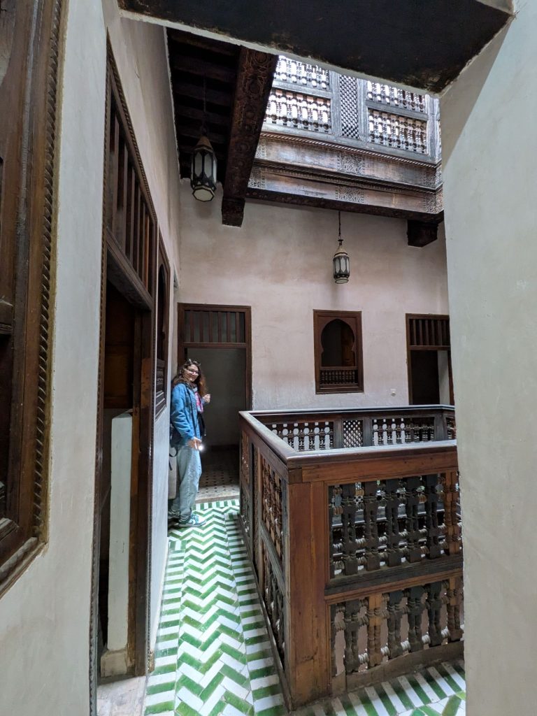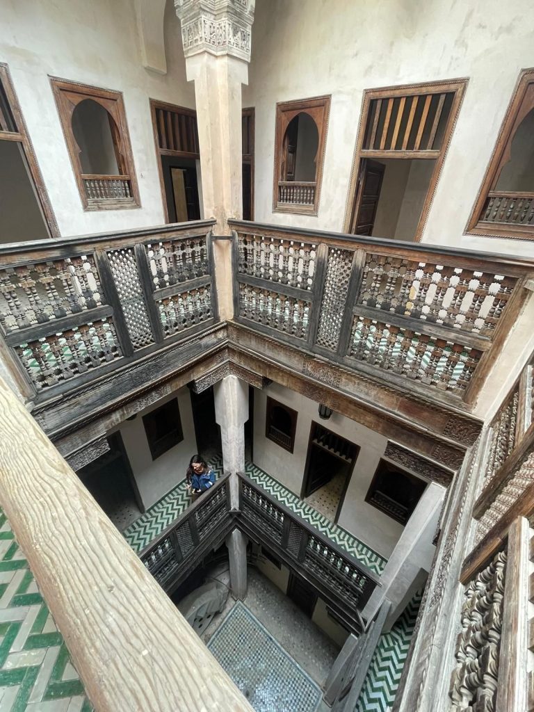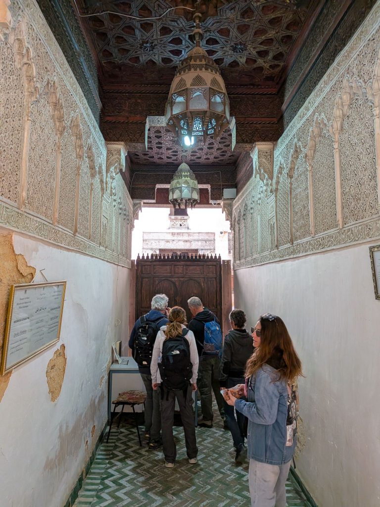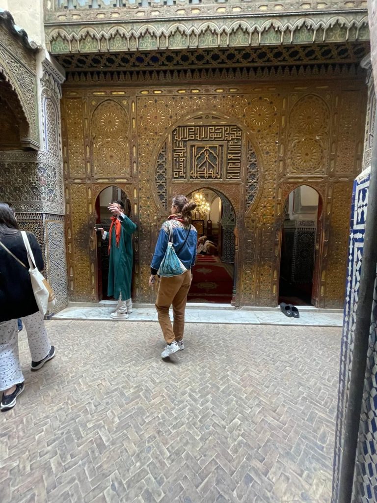 Nous rentrons ensuite dans la médersa La meilleure Cherattine, fondée par le sultan Moulay Rachid en 1671. Une médersa est une école religieuse islamique traditionnelle. Celle-ci n’est plus utilisée, seulement en tant que musée. Elle a été achevée par le sultan Moulay Ismail en 1678 en faisant un centre pour les sciences à cette époque. Elle comprend 230 chambres, et une salle de prière. La médersa accueillait des étudiants de différentes régions du Maroc. La fontaine au milieu sert aux ablutions, avant de venir s’asseoir en demi-lune dans la salle de prière.