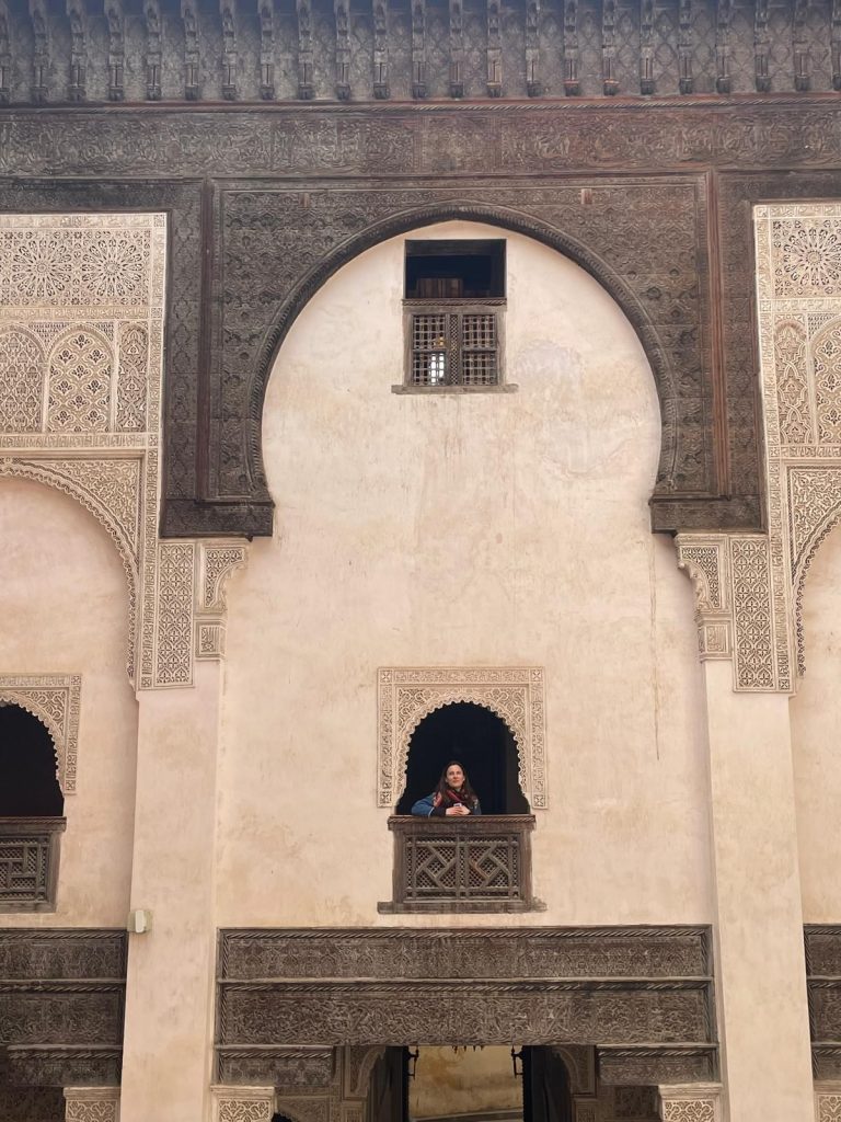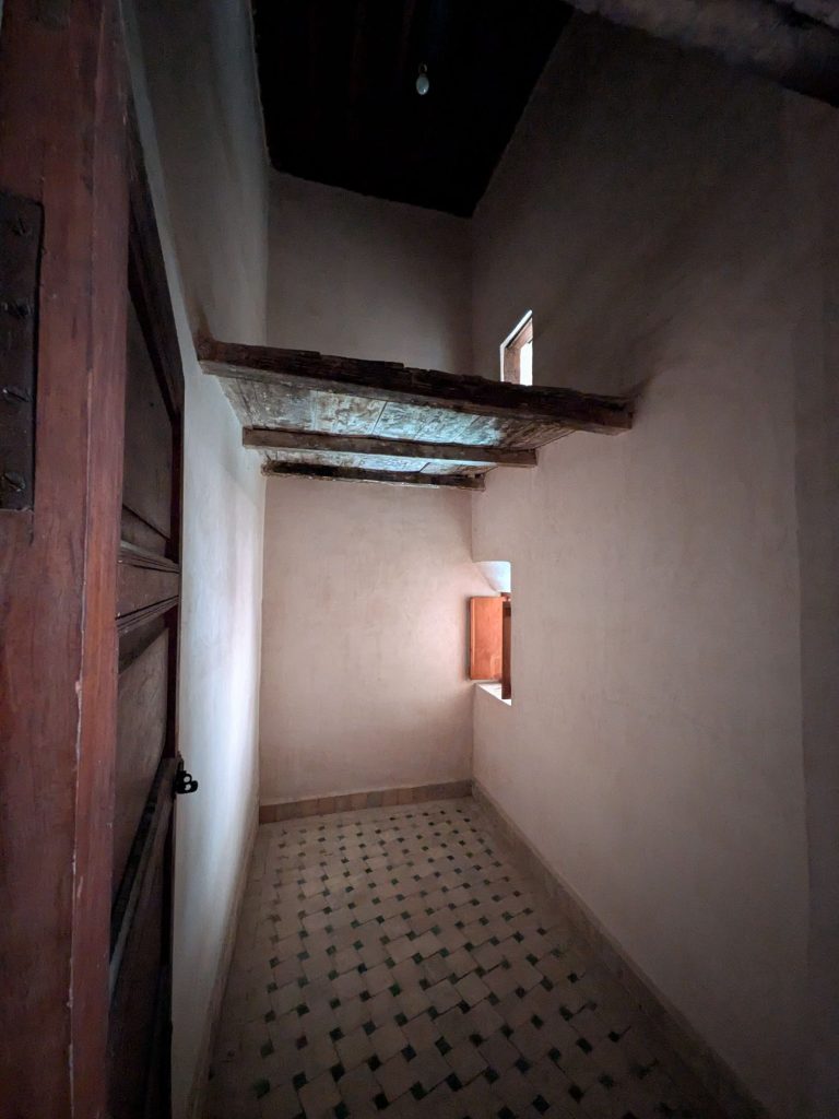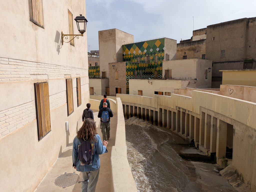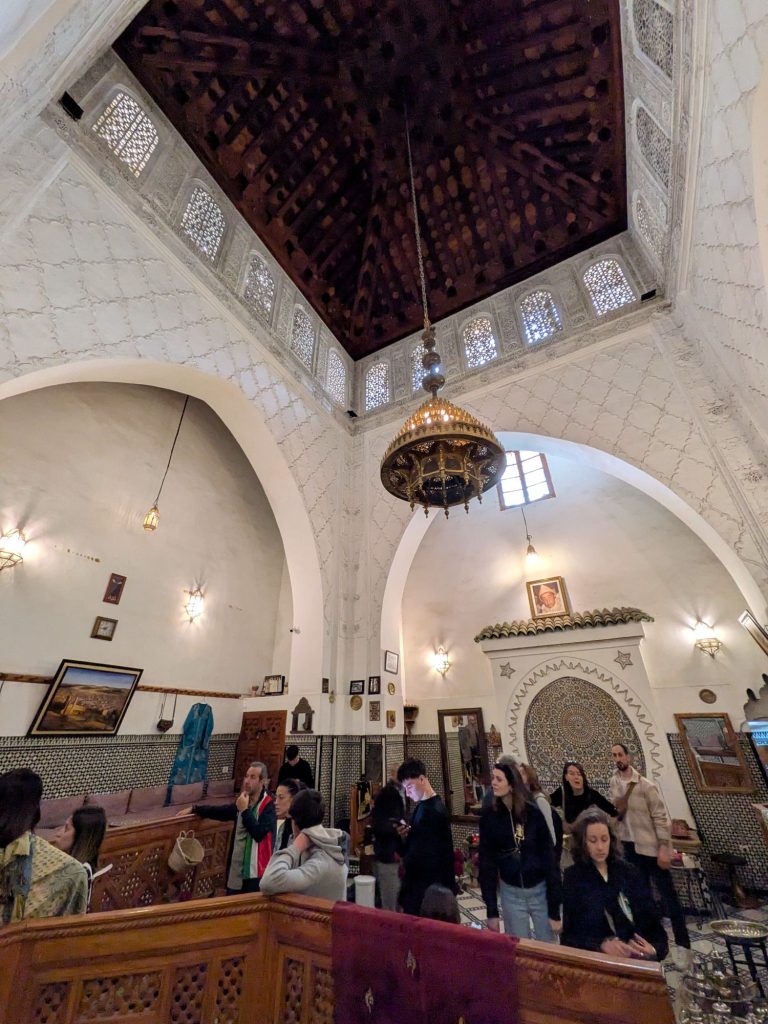 Nous rentrons ensuite dans la médersa La meilleure Cherattine, fondée par le sultan Moulay Rachid en 1671. Une médersa est une école religieuse islamique traditionnelle. Celle-ci n’est plus utilisée, seulement en tant que musée. Elle a été achevée par le sultan Moulay Ismail en 1678 en faisant un centre pour les sciences à cette époque. Elle comprend 230 chambres, et une salle de prière. La médersa accueillait des étudiants de différentes régions du Maroc. La fontaine au milieu sert aux ablutions, avant de venir s’asseoir en demi-lune dans la salle de prière.