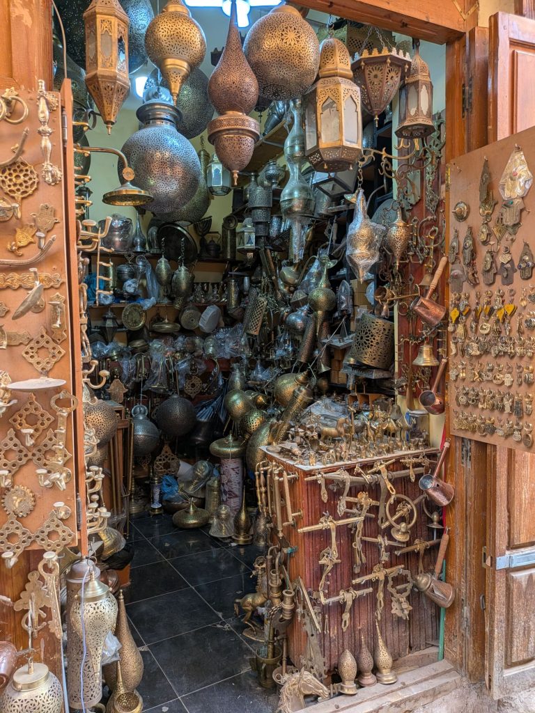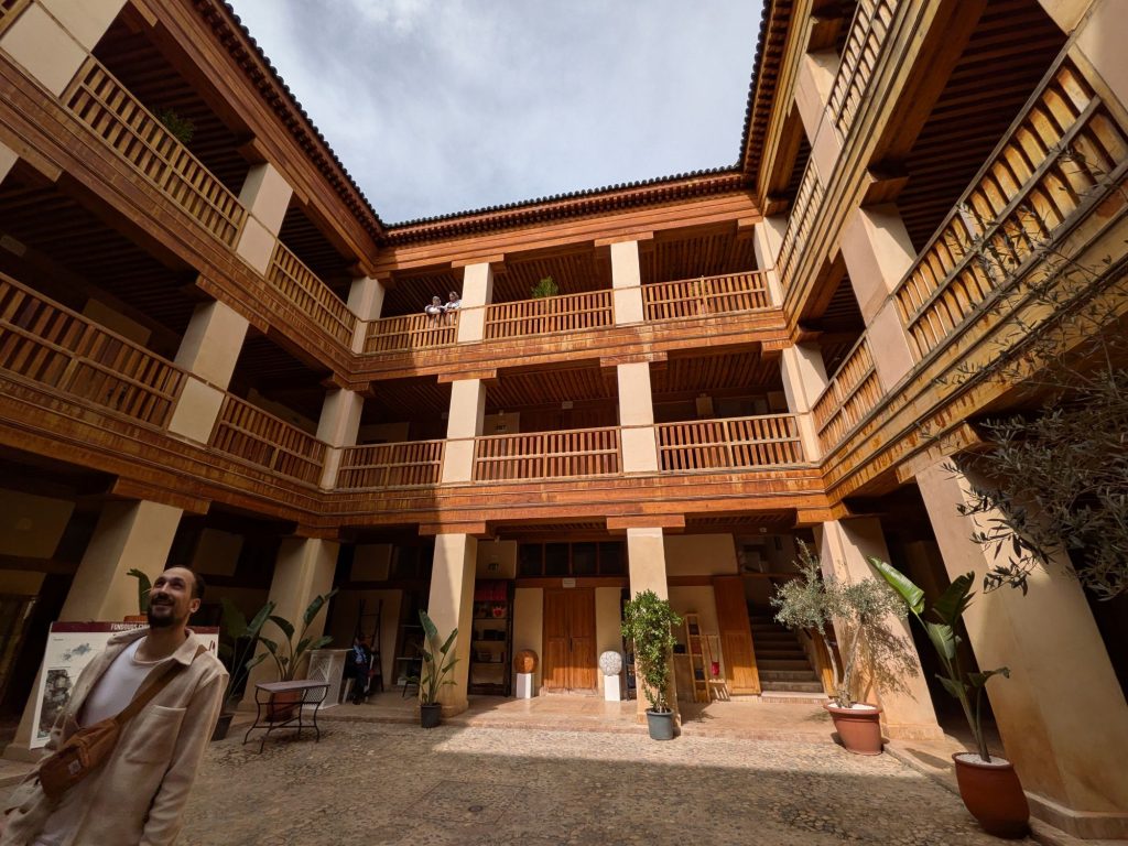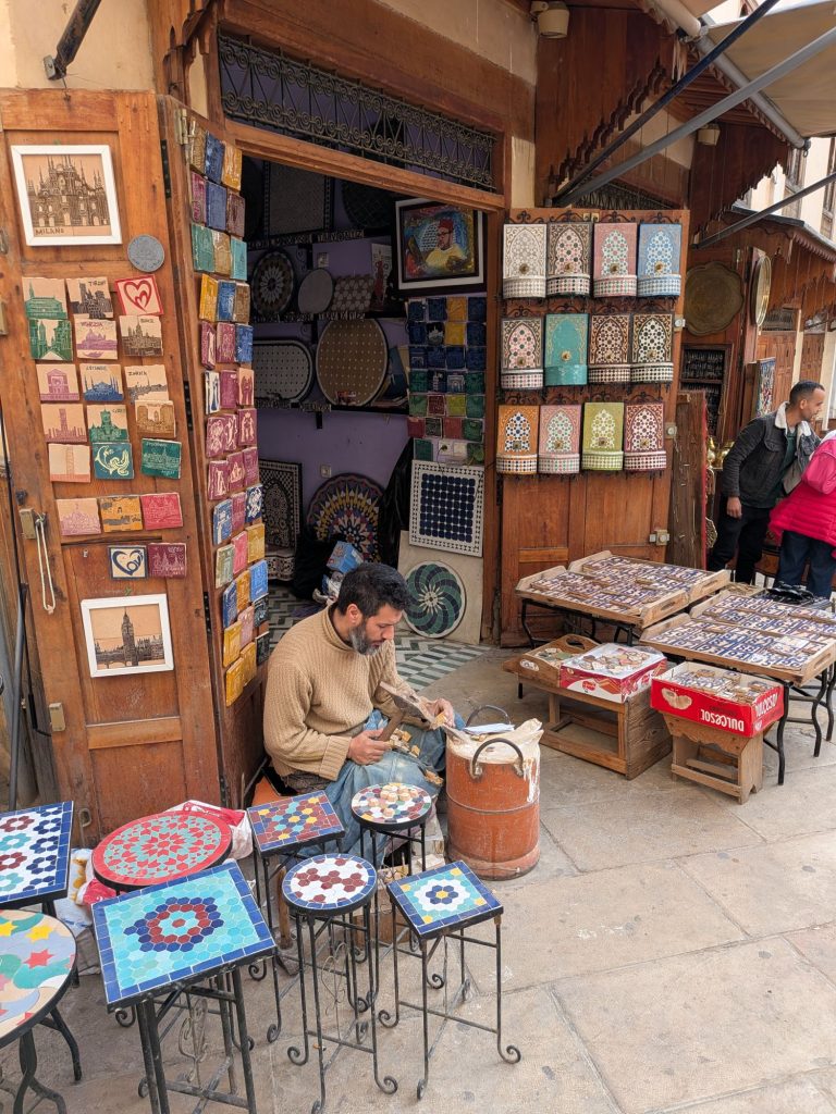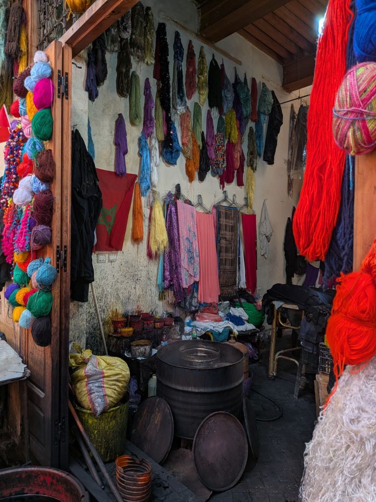 Ensuite, nous traversons Fondouk Kaat Smen. C’est un ancien fondouk (caravansérail urbain : auberge-entrepôt pour marchands et animaux) qui a été entièrement restauré et transformé en espace d’artisanat traditionnel. Aujourd’hui, on y trouve uniquement des artisans locaux (bois, cuir, textile, broderie, etc.). Comme on est vendredi, il n’y a que deux artisans ouverts, dommage.