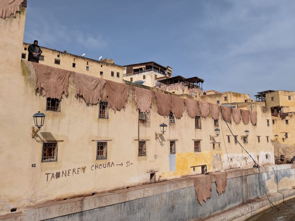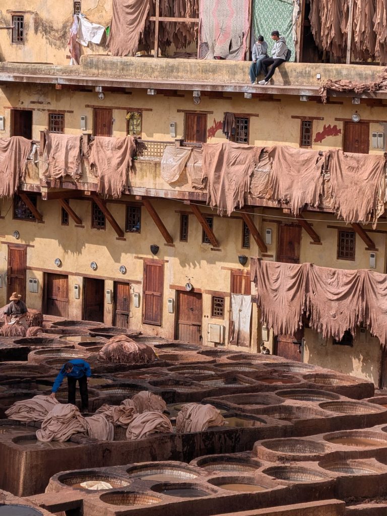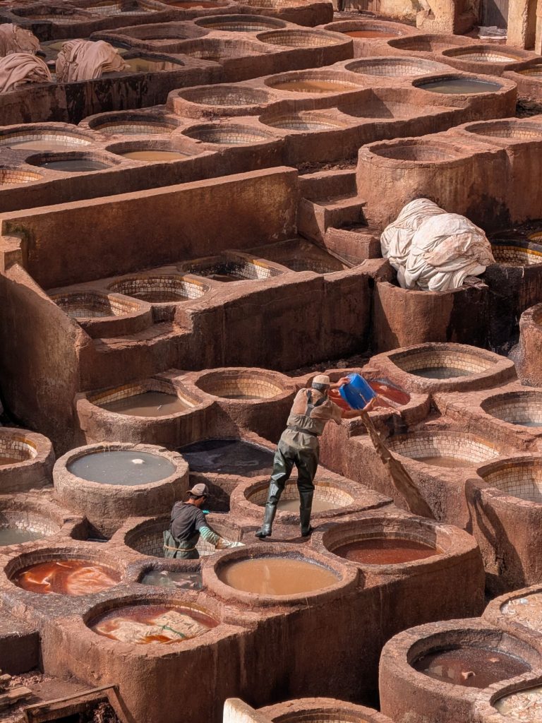 Nous arrivons à la tannerie de Fès, l’un des sites artisanaux les plus emblématiques du Maroc, et même du monde.