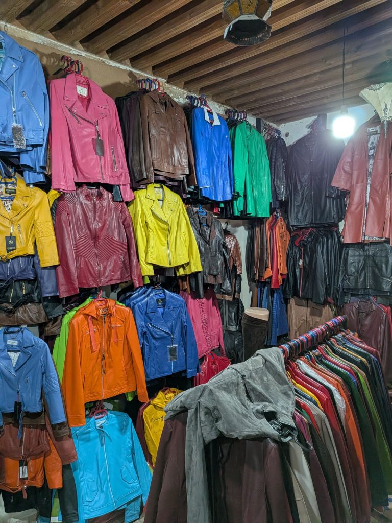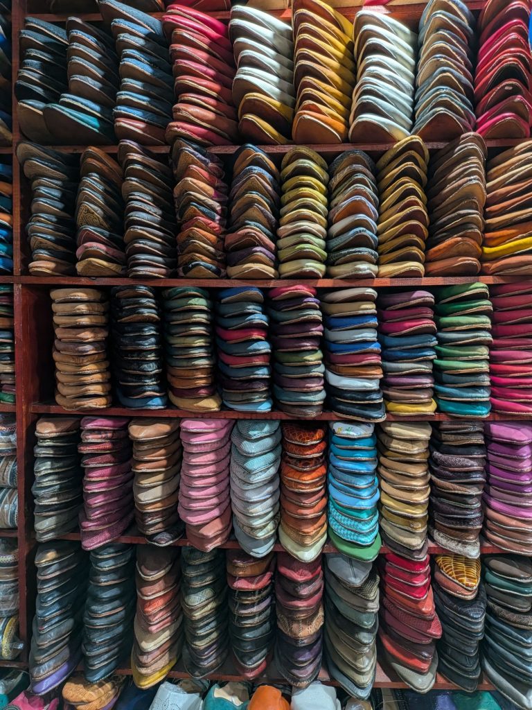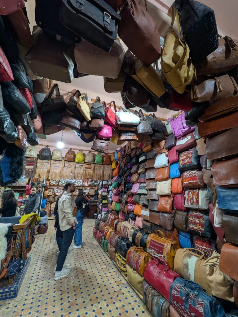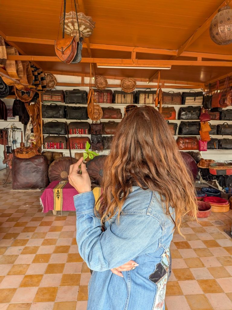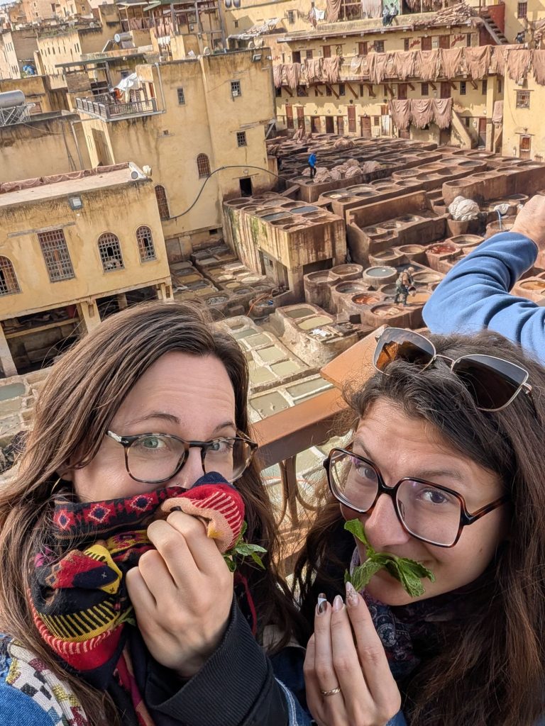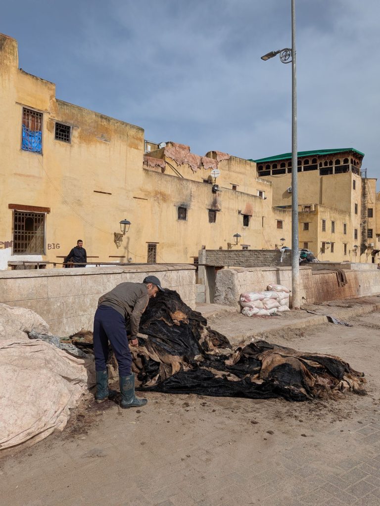 Les méthodes traditionnelles utilisent des matières organiques (historiquement chaux, fientes, tanins végétaux). Résultat : une odeur très puissante — c’est pour ça qu’à l’entrée de la tannerie, nous recevons une feuille de menthe chacun à mettre sous le nez lors de la visite.