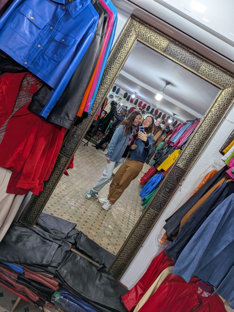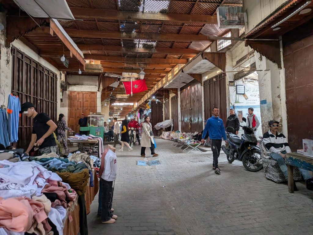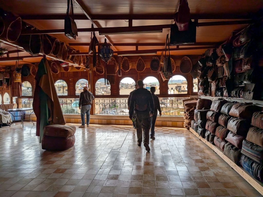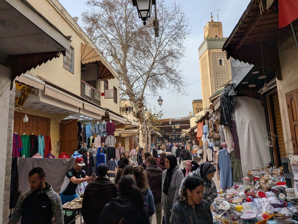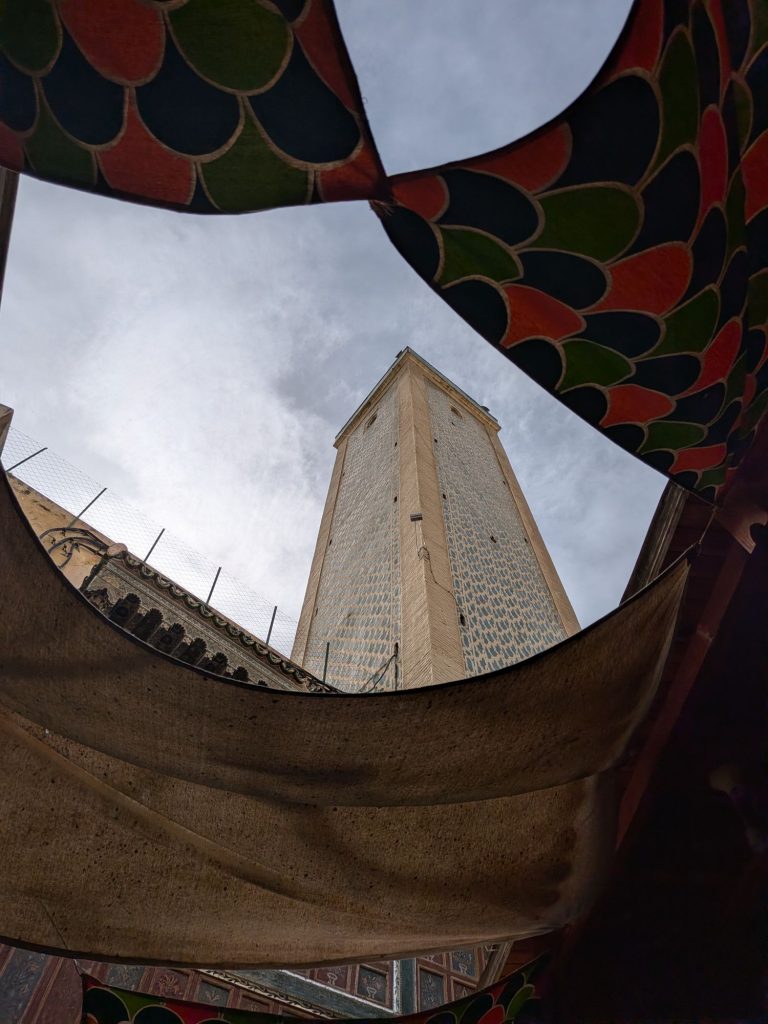 Ensuite nous visitons rapidement un magasin de tissus avant d’aller faire un tour sur le toit-terrasse pour avoir une vue sur la mosquée université. On n’a pas trop le temps de regarder les différents tissus ou écharpes que la promenade continue à travers la médina.