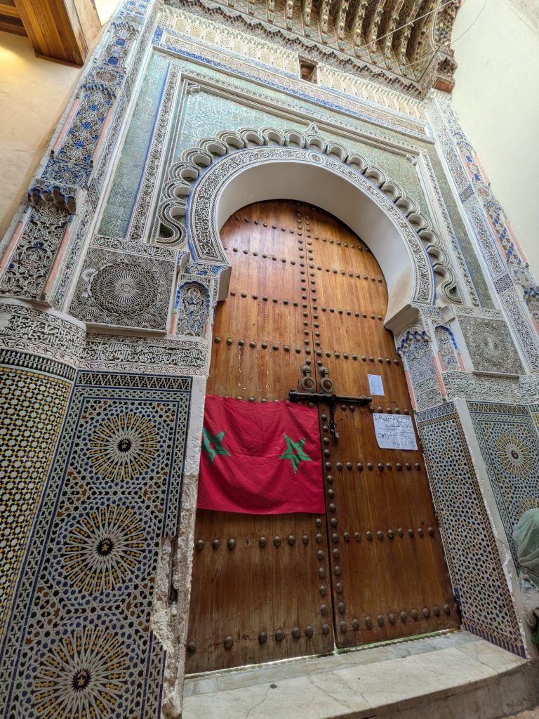Nous ne pouvons admirer que l’architecture, et une des portes menant au mausolée de Moulay Idriss II. Le porte est fermée mais nous aurons l’occasion plus tard de l’apercevoir à travers une porte ouverte de la mosquée qui le contient. La porte et ses décorations datent du 15eme siècle.