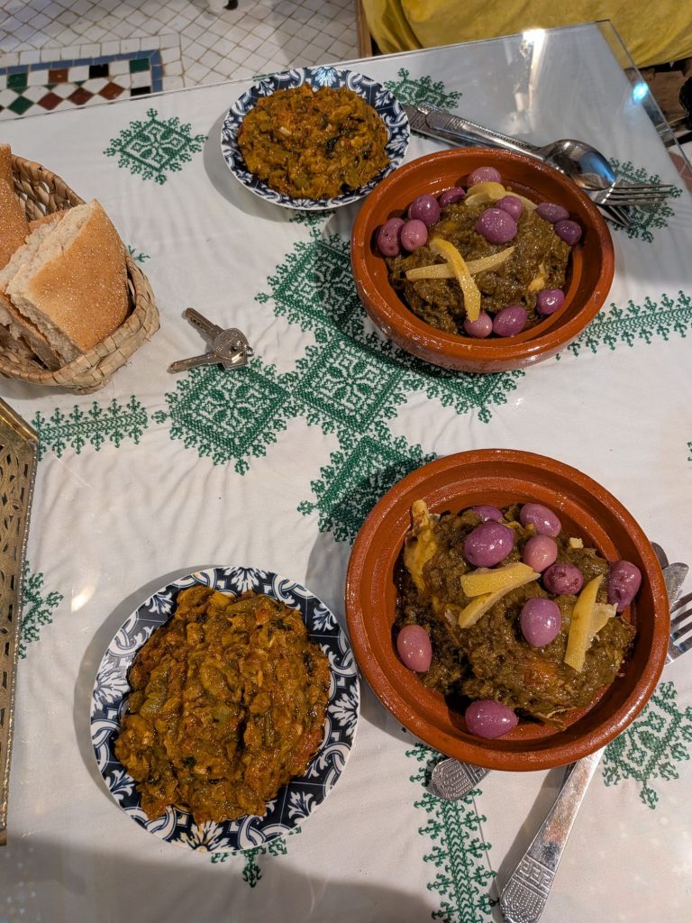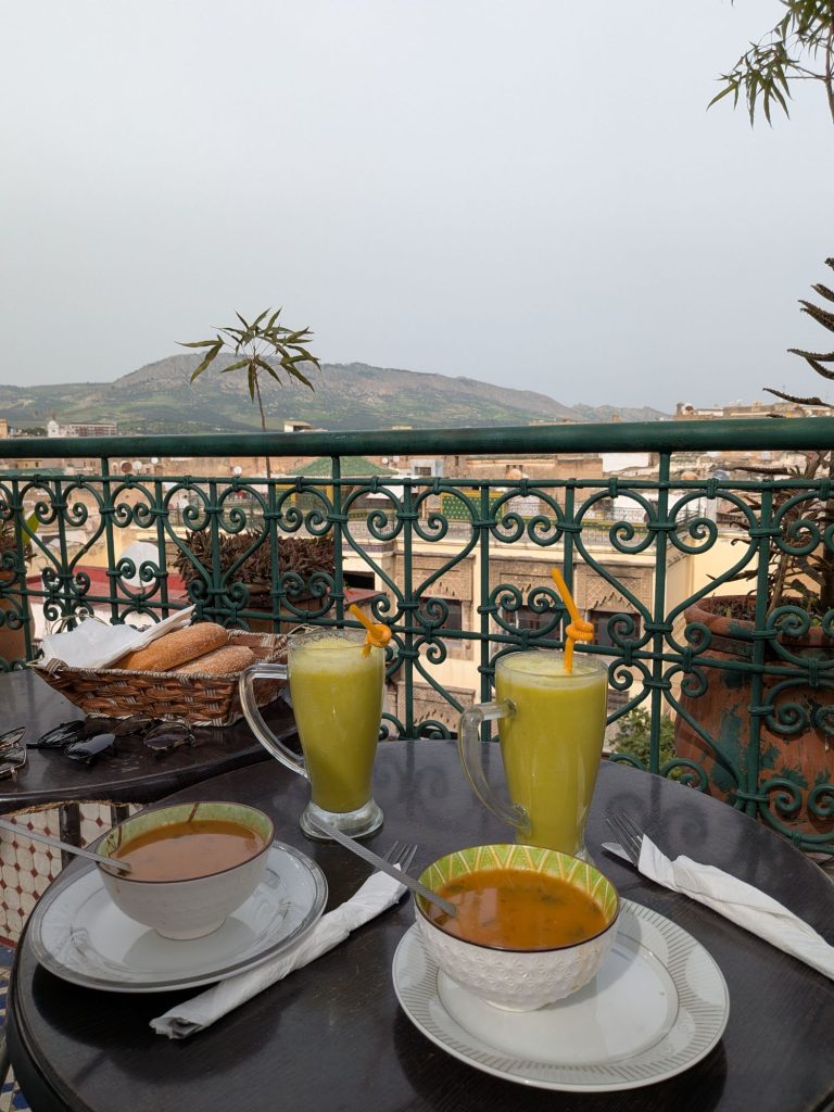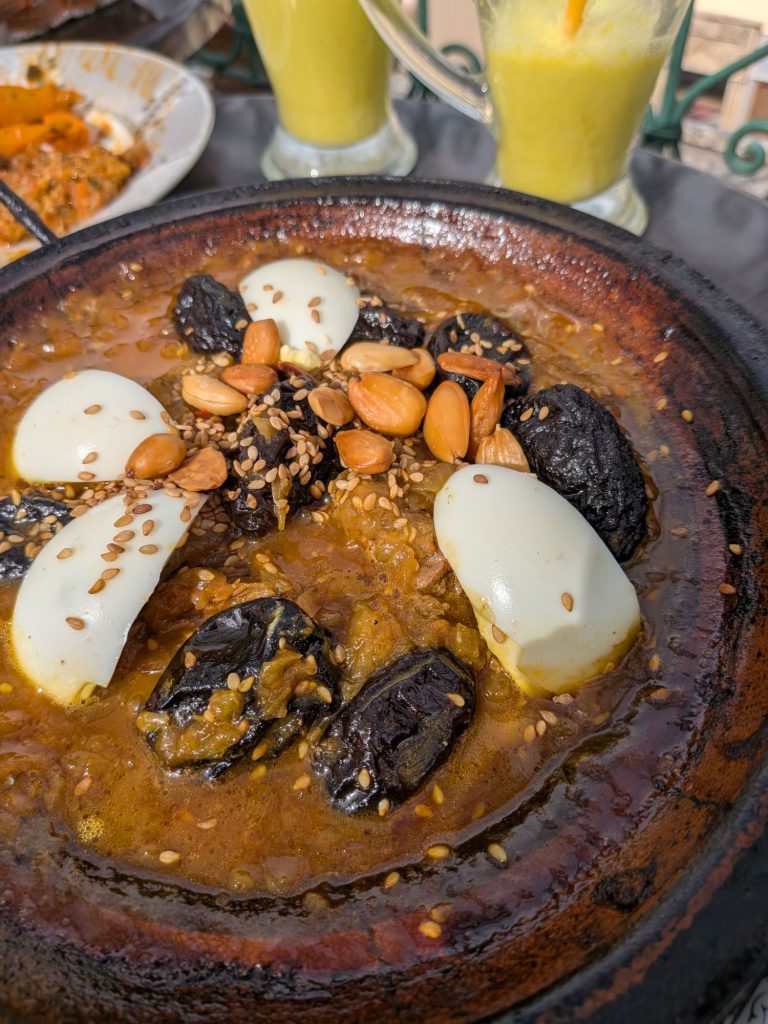 On commande un jeu à base d’avocat et de jus d’orange ainsi qu’une salade marocaine cuite et un tajine aux pruneaux et amandes. On a une super vue. La nourriture est bonne et il fait super bon le soleil pointe le bout de son nez. La température est vraiment idéale !
