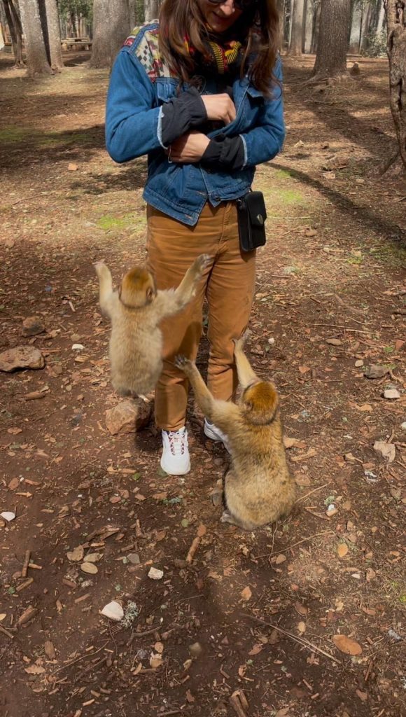 On arrive au parc national d’Ifrane, où des macaques de Barbarie ont élu résidence dans une grande forêt de cèdres. Malheureusement, j’avais oublié que j’étais très peu à l’aise avec les singes surtout avec les grands 🤣. À peine le minibus arrêté qu’une horde de marocains nous tendent des sachets de cacahuètes, carottes, pommes, et nous proposent de monter sur leurs chevaux pour une photo ou une balade. On achète 1 sachets chacune, Julie s’amuse, moi je reste près de Tarek qui chasse les gros magots qui me font peur 🤣. Il faut dire que le premier singe qui s’accroche à la jambe de Julie lui mord la jambe! Déjà qu’ils me font peur, je suis encore moins rassurée !