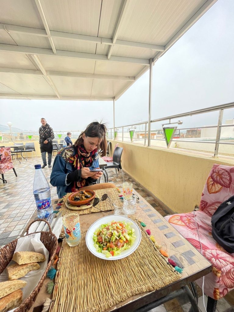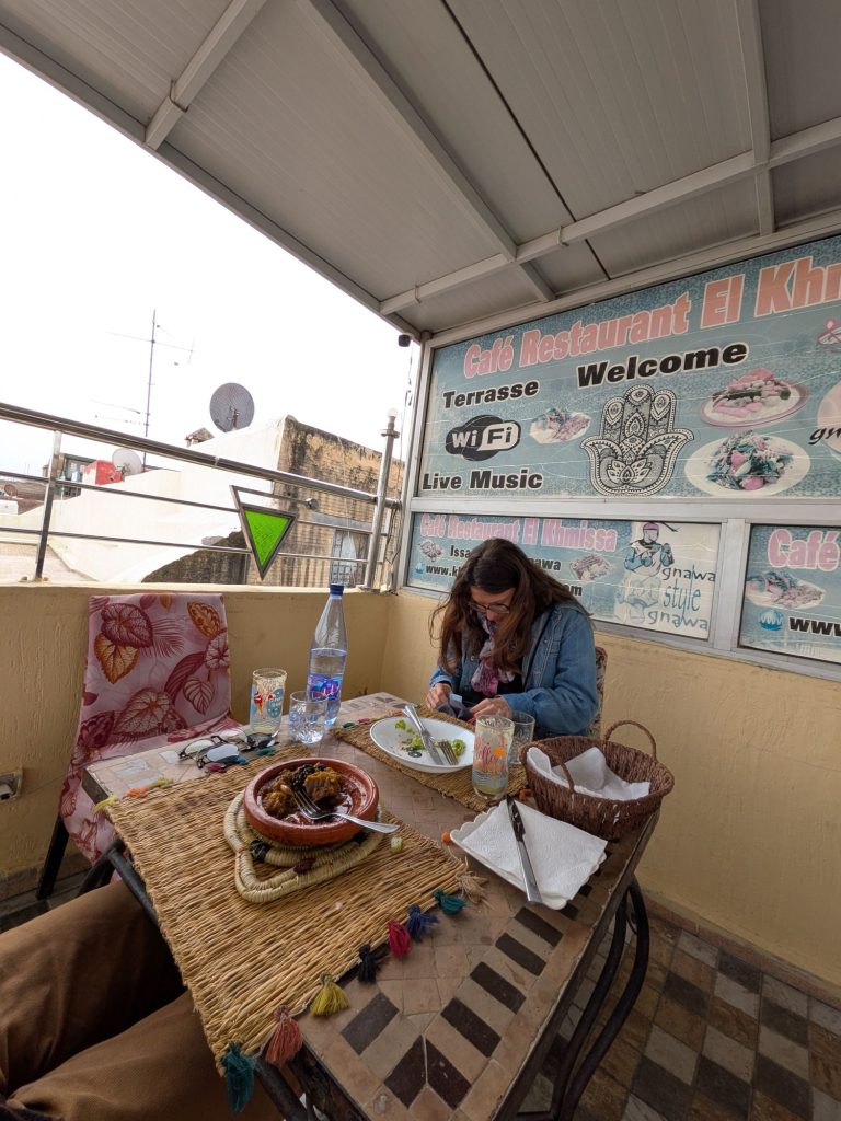 Le midi, on va manger dans un restaurant qui possède un toit-terrasse, et qui nous a été recommandé par Tarek. Dernier tajine du séjour !