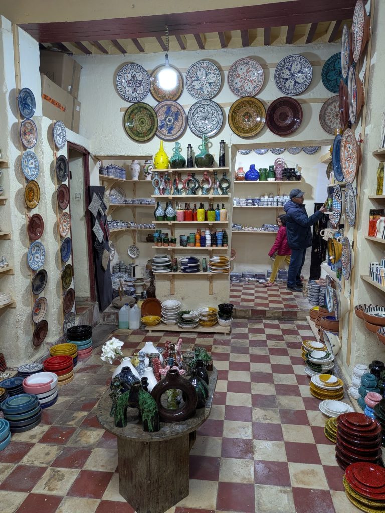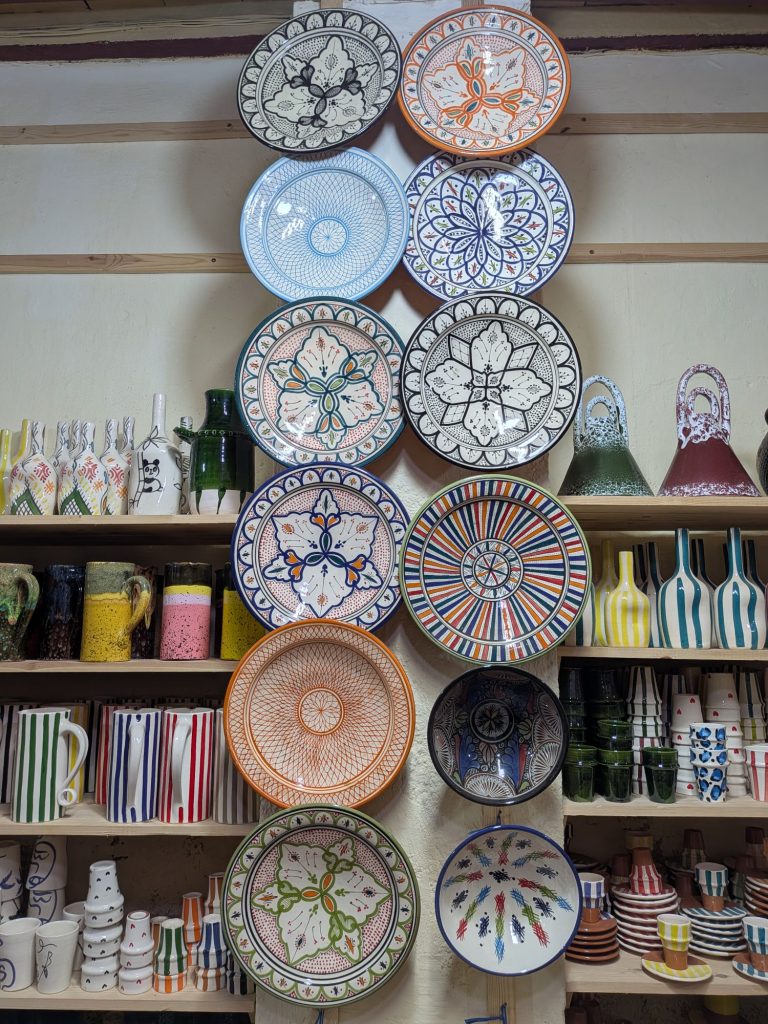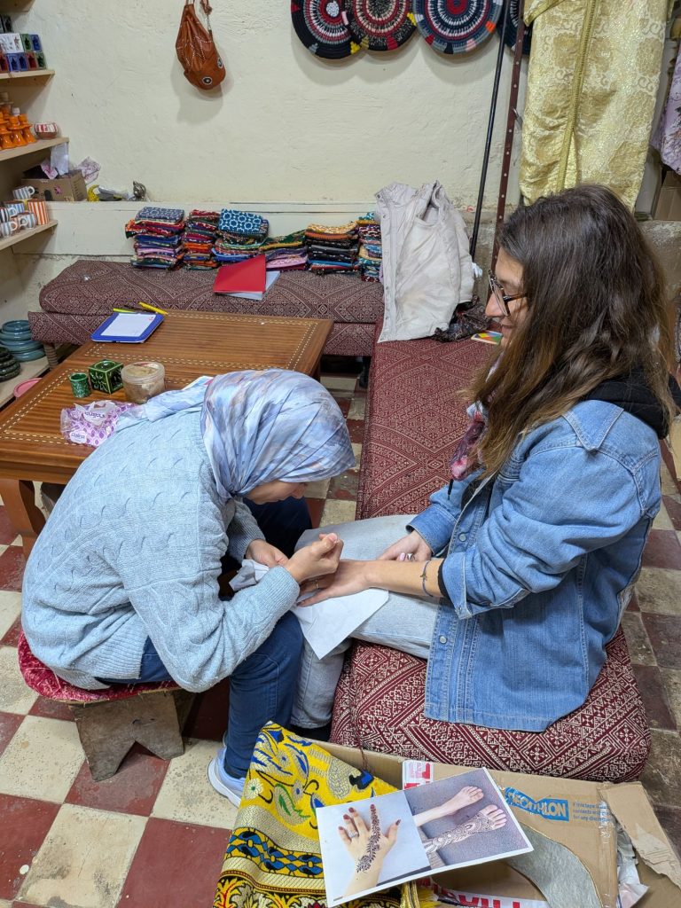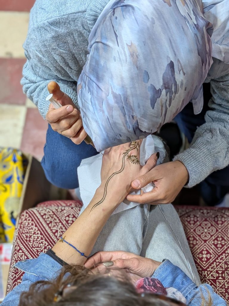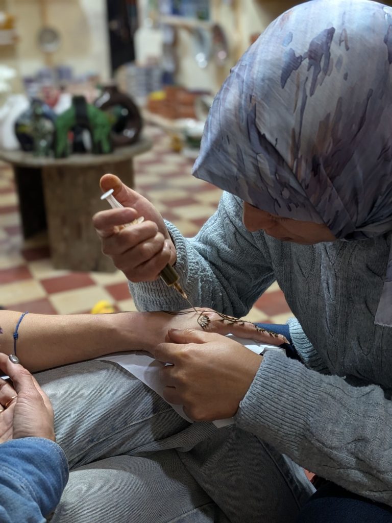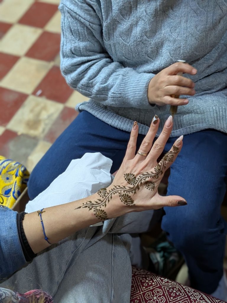 Juste après, Julie va se faire un tatouage au henné dans une jolie boutique de poterie repérée juste avant d’aller manger. On est justement dans le « quartier du henné », beaucoup de boutiques ici en proposent.